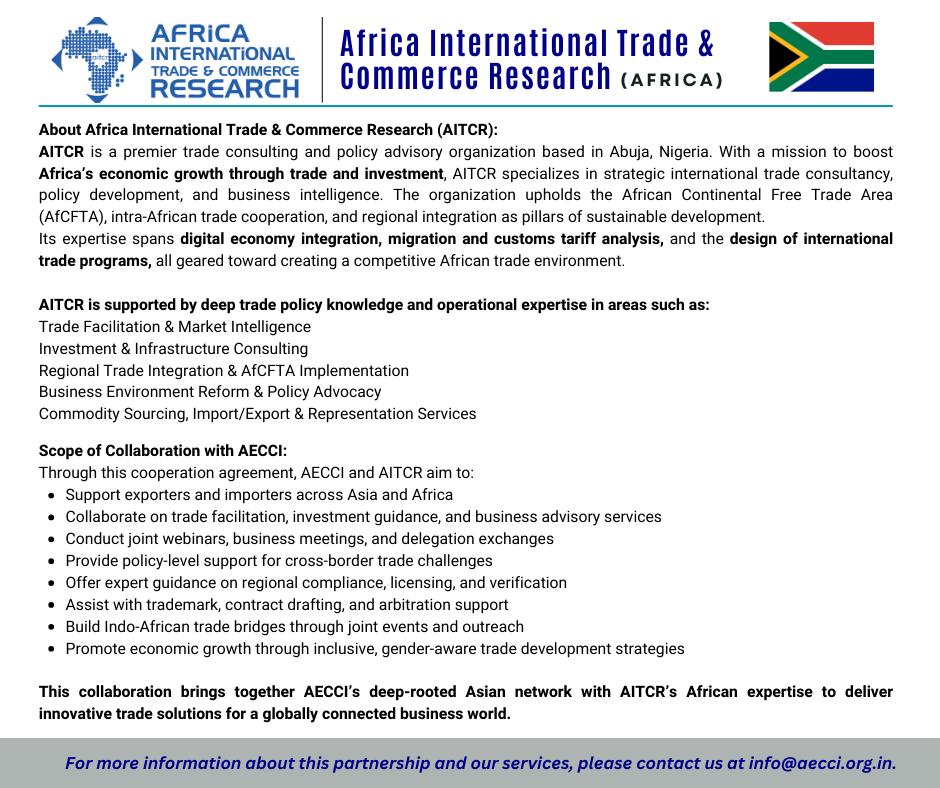 AECCI proudly announces its strategic collaboration with Africa International Trade & Commerce Research (AITCR) – a reputed institution based in Nigeria dedicated to advancing sustainable trade, investment, and development across the Africa.