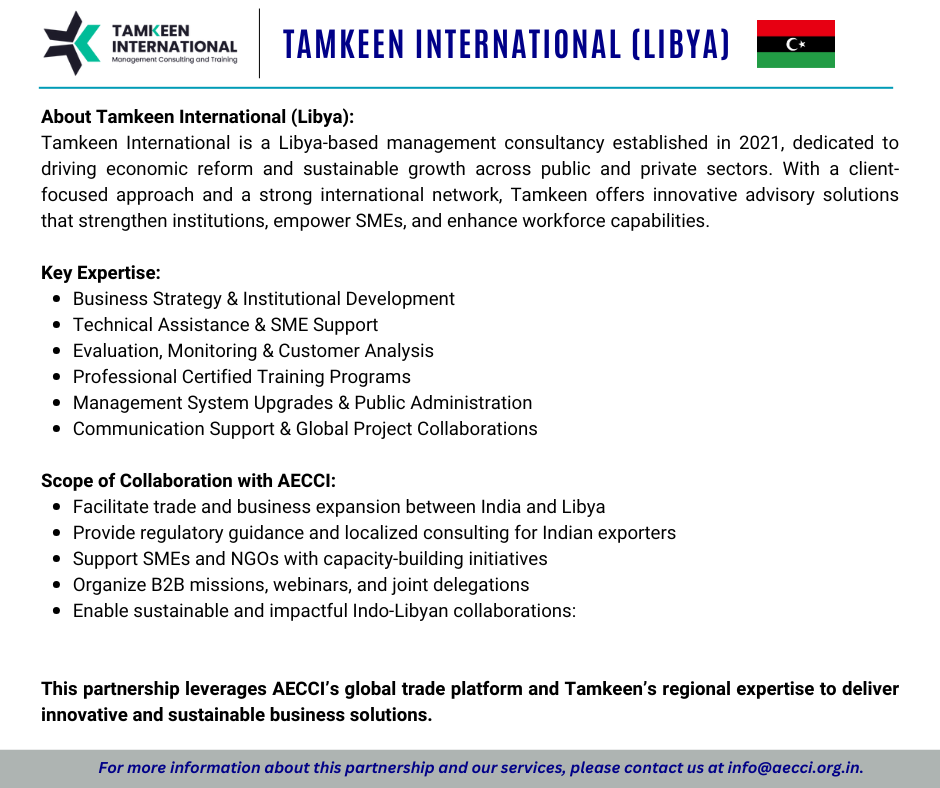 Through this partnership, AECCI and Tamkeen International aim to deepen trade and investment opportunities, advance capacity-building initiatives, and facilitate sustainable growth between India and Libya.